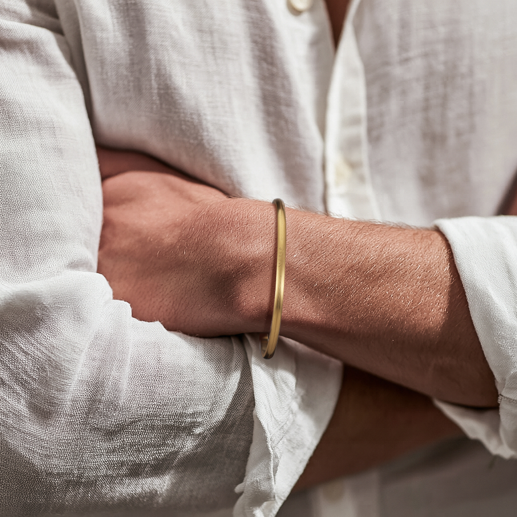 Slide the open side over the narrowest point of your wrist, squeeze for a snug fit, and pair it with your favourite watch or a curb-chain for an easy layered look. The muted matte surface adds understated edge to tees, hoodies or suit cuffs.