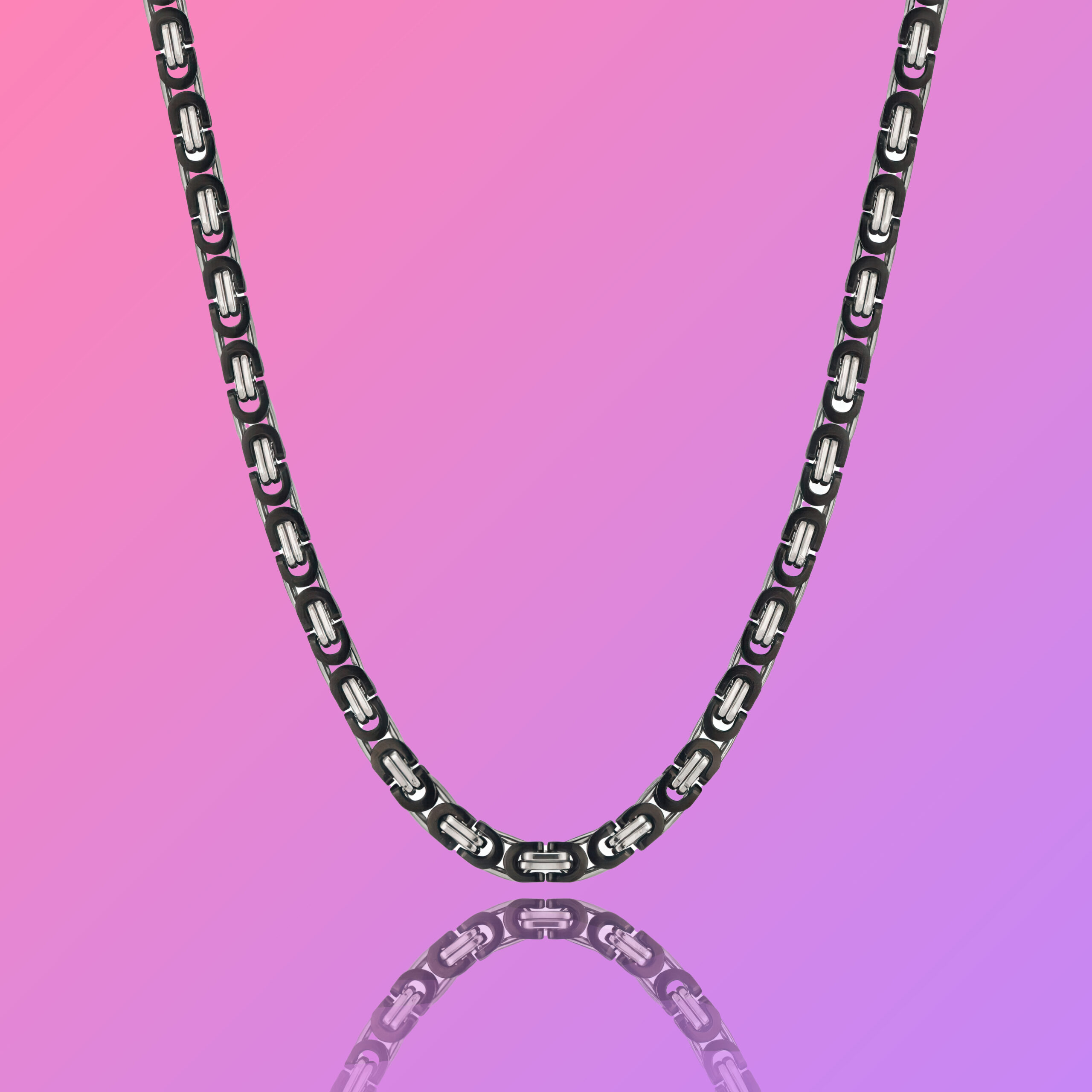 Add bold sophistication to your style with the ONYX Byzantine Necklace by Alfred & Co. London. Featuring a sleek 5mm flat-link design in contrasting silver and black stainless steel, this men’s chain delivers a powerful balance of elegance and ruggedness.